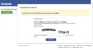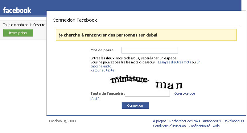 Le message d’accueil indique que « Je cherche à rencontrer des personnes sur Dubaï » donc. Je ne le savais pas, mais Facebook doit sonder mon subconscient, alors j’avoue. En même temps c’est normal, j’ai un cerveau hyper-puissant, j’arrive à remplir les captchas de Rapidshare qui sont désormais réservés à l’élite de la nation :