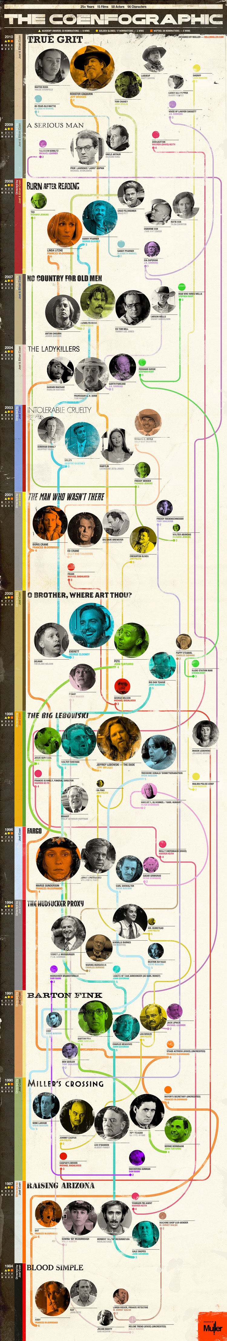 Les 15 films des frères Coen (y compris True Grit) détaillés dans une magnifique infographie. 25 ans, 50 acteurs, 96 personnages, et de nombreuses nominations et récompenses.