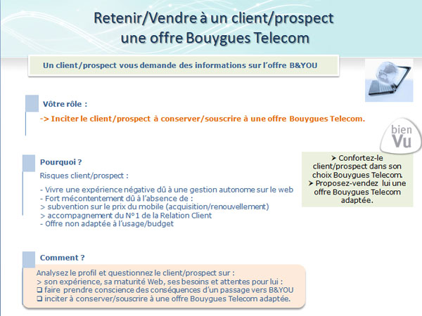En l’occurrence, tandis que nous avions déjà relayé le lancement de B&You avec des réserves sur l’offre data, on a appris qu’un document interne chez Bouygues invite les conseillers-vendeurs à ne pas recommander cette offre, argumentaire à l’appui. C’est le site Univers Freebox qui diffuse ledit document, sans équivoque possible.