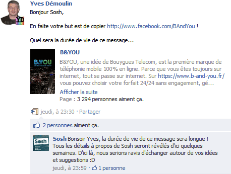 Orange a-t-il été pris de court par l’annonce de Bouygues et s’est-il senti le besoin de faire la sienne aussi rapidement ? Car pour avoir des informations sur Sosh, il faudra regarder partout sauf sur les espaces « officiels » : une page Facebook et un compte Twitter (@sosh_fr). Pas de site web (d’ailleurs sosh.com, sosh.net, sosh.fr sont déjà pris, dommage que so.sh n’existe pas encore), pas de vidéo (malgré une chaîne dailymotion.com/sosh, Youtube semble être délaissé). Tout se passe donc sur Facebook pour le moment, avec cette description que l’on retrouve partout :